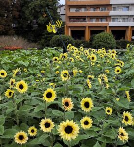 座間市の「かにが沢公園」(相武台前駅より徒歩5分)にて座間市の花、ひまわりを冬にも咲かせようという「冬のひまわりプロジェクト」が進んでいます。有志による「まちの活性化委員会」が創意工夫あふれる取り組みを進めていて、私も参加しました。11月9日開催の座間市民ふるさとまつりの時に、2万本のひまわりが満開になるようにしていて、12月中旬まで楽しめます。生け花サークルの協力で、ひまわりと生け花のコラボや切り花も行われました。昨年も座間市が話題になるようにと、冬のひまわりを咲かせています。市の活性化につながる取り組みです。今後もがんばります。