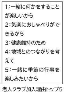 座間市老人クラブ連合会が、老人クラブに入った理由をアンケートしてトップ5が表のような結果でした。そのうえで私は、①老人クラブ活性化に向けて市の補助増額、②老人クラブ加入促進に向けての講師費用の補助、③老人クラブに7連協あるのでハーモニーホール座間などで交流することへの市の後援と費用補助、④老人クラブごとに年会費が1500円から3千円の幅があり、一定の年会費になるよう不足分の補助、⑤老人クラブが幼稚園や老人ホームなどへボランティア参加していることから広報の支援、⑥年2回、毎回約2千部発行している市老連だよりを市の窓口にも配架するなど広報支援という6点を提案しました。このことへの見解と、他に座間市として老人クラブの活性化に対して考えられることを市長に質問しました。