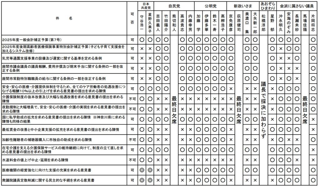 ◎は議員提案会派、〇は賛成、×は反対、△は退席