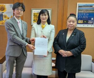 予算要望書は、党市議団に寄せられた市民の声をまとめたもので、医療・介護・子育て支援、教育、災害対策、基地対策、中小企業支援、農・商業振興、環境対策、都市環境整備、公共の維持発展など9本柱の449項目に及んでいます。特に、重点支援交付金の有効活用、水道料金値上げ中止や減免、開始された学校体育館へのエアコン設置の早期完了、難聴者への補聴器購入補助、一般住宅対象のリフォーム助成、投票しやすい工夫などを要望しました。